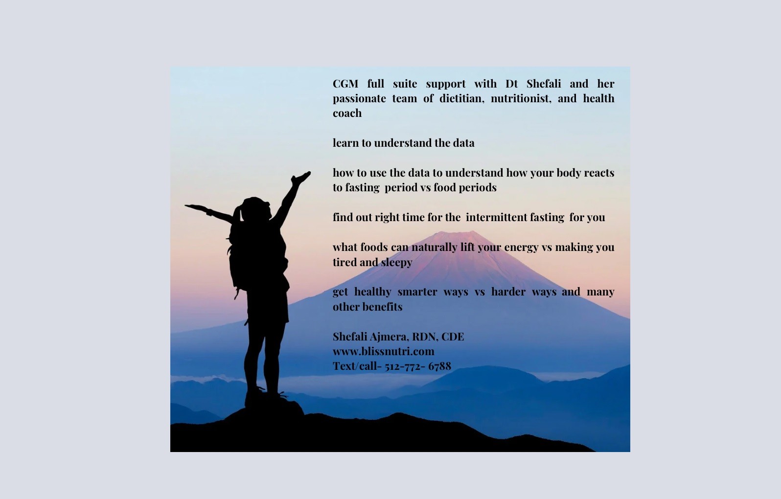 "I am excited to expand access to CGM for Austinites, as it has the potential to transform the lives of individuals living with diabetes," said Shefali Ajmera. "By offering affordable rates and providing full support, I aim to empower individuals to take control of their health and make informed decisions about their lifestyle choices." For more information about CGM availability and to schedule a consultation with Shefali Ajmera, please visit her website at www.blissnutri.com or contact her office at 512-772-6788 or Myhealth.s@gmail.com. About Shefali Ajmera: