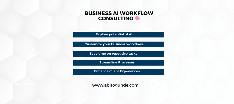 With Business AI Workflow Consulting, Abi Togunde-Sanders aims to bridge this gap by working closely with companies to identify opportunities for AI integration, streamline processes, and optimize workflows for maximum efficiency. By leveraging her extensive expertise in technology and automation, Abi will guide businesses through the entire AI implementation process, ensuring a seamless transition and long-term success.