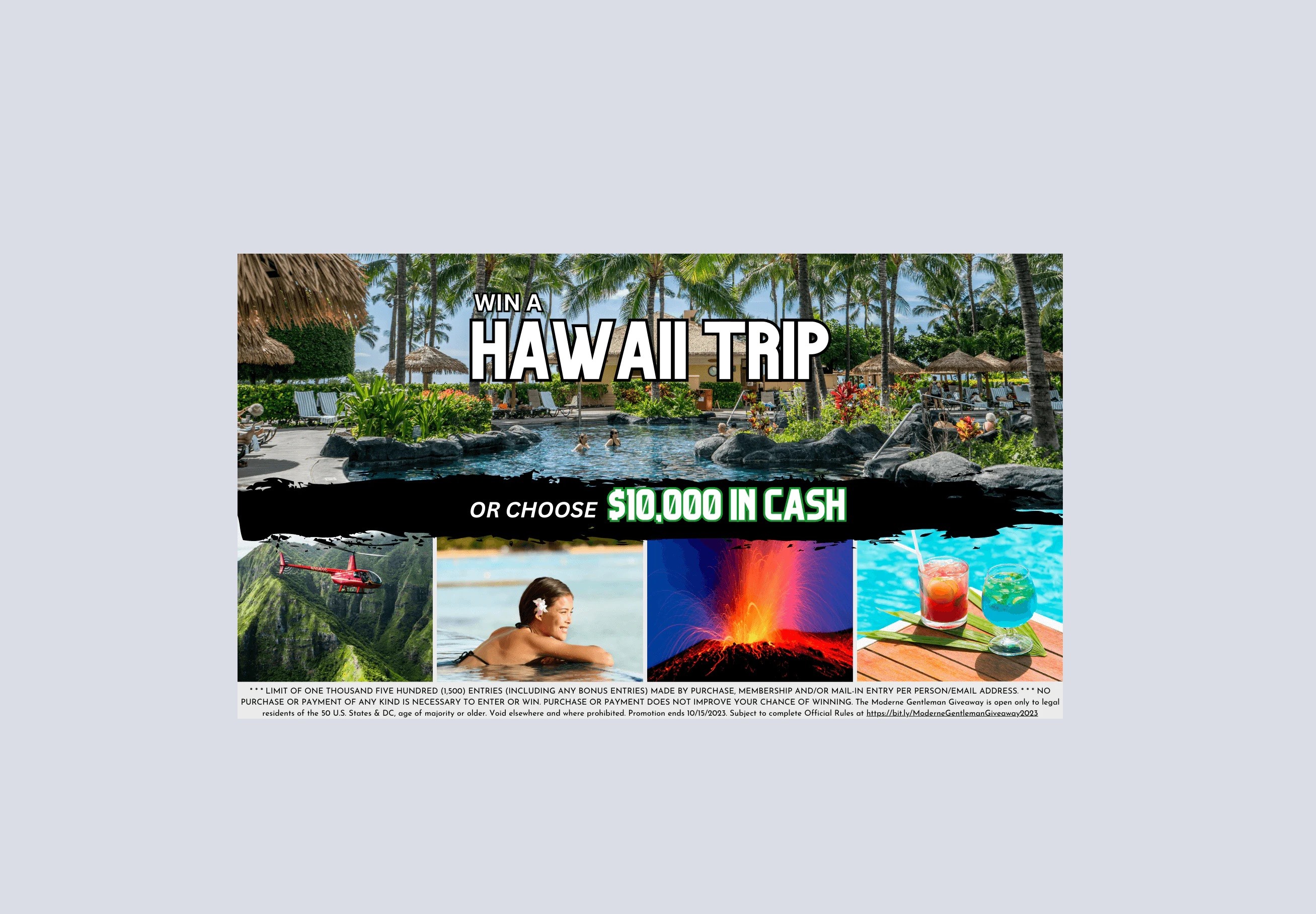 Orange County CA, September 1, 2023 (USANews.com) - The Moderne Gentleman, a leading lifestyle brand dedicated to making travel experiences easier with its innovative products, they are thrilled to announce an exciting giveaway that will make one lucky winner's dreams come true. The company is offering an extraordinary opportunity to win an all-expenses paid trip to the breathtaking paradise of Hawaii. The winner of this incredible giveaway will receive two round-trip tickets from their nearest airport to the enchanting island of Oahu, Hawaii. They will indulge in the lap of luxury with a four-night, five-day stay at a prestigious hotel, ensuring an unforgettable experience in one of the world's most sought-after destinations. But that's not all! Moderne Gentleman is taking this Hawaiian getaway to the next level by offering the winner a choice between two unique experiences. They can either embark on a thrilling Jurassic Park tour, where they will explore the stunning landscapes that served as the backdrop for the iconic movie franchise, or take to the skies with a breathtaking helicopter ride, providing unparalleled views of Hawaii's natural wonders. To make this dream vacation even more enticing, the lucky winner will also receive $2500 in cash to spend as they please. However, if they prefer, they can opt for the cash prize of $10,000 instead of the trip, allowing them to spend it on whatever they choose. The giveaway will be open for entries from September 1, 2023, to October 15, 2023. Participants can enter by visiting Moderne Gentleman's website and clicking on the Giveaway tab or by Clicking Here and following the simple instructions. Don't miss this once-in-a-lifetime opportunity to experience the beauty and luxury of Hawaii without spending a dime! "We are thrilled to offer this incredible opportunity to our valued customers and fans," said Greg, Co-Founder at The Moderne Gentleman. "Hawaii is a destination that captures the imagination of travelers around the world, and we wanted to give someone the chance to experience its magic firsthand. We hope this giveaway brings joy and excitement to all who enter." About Moderne Gentleman: The Moderne Gentleman is a lifestyle brand committed to providing products that make traveling easier and more convenient. From luxury travel to fashion, grooming, and more, The Moderne Gentleman aims to inspire and elevate the modern man's lifestyle. With a focus on quality, sophistication, and unparalleled customer service, the brand has garnered a loyal following of tasteful individuals who appreciate the finer things in life.
