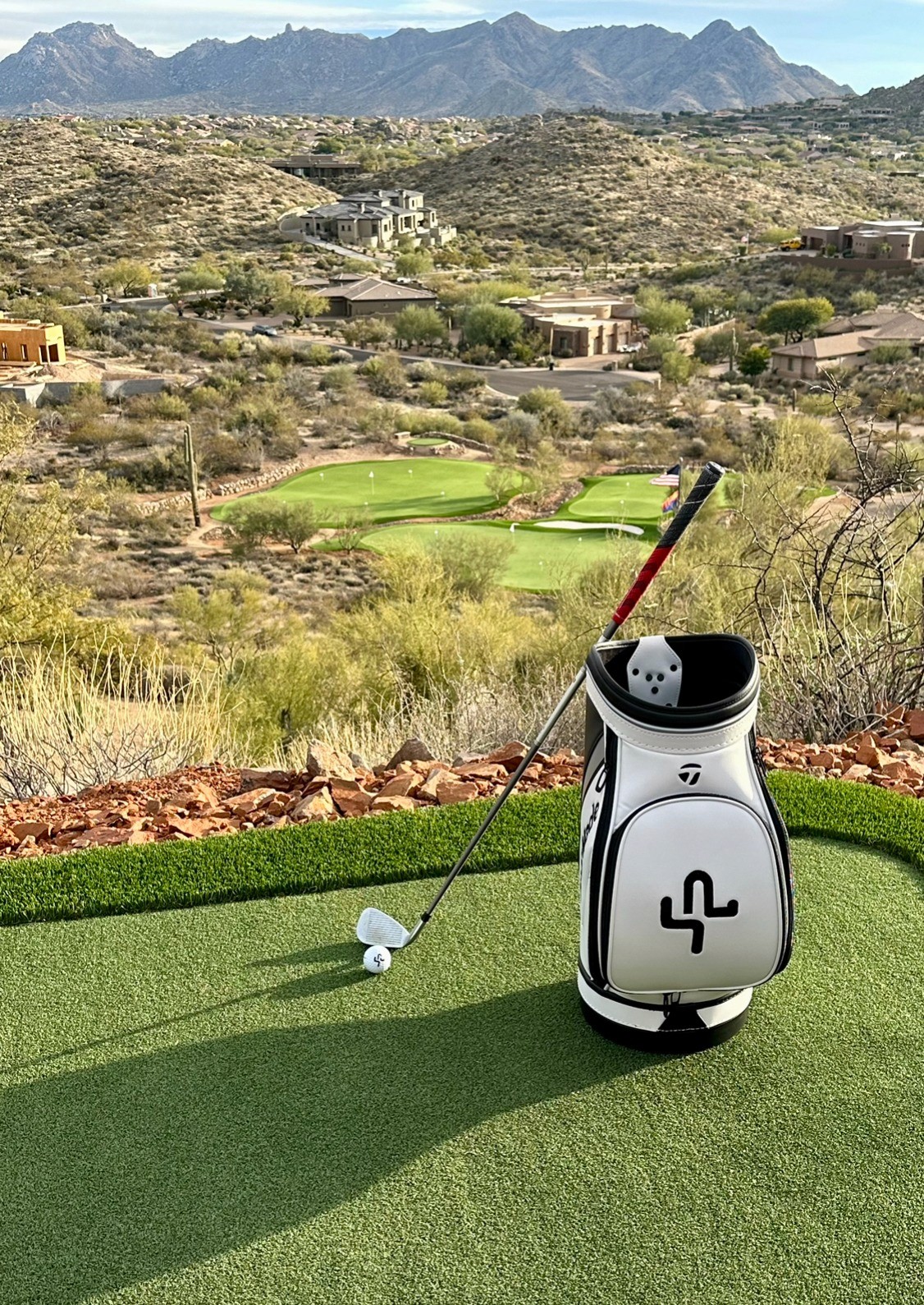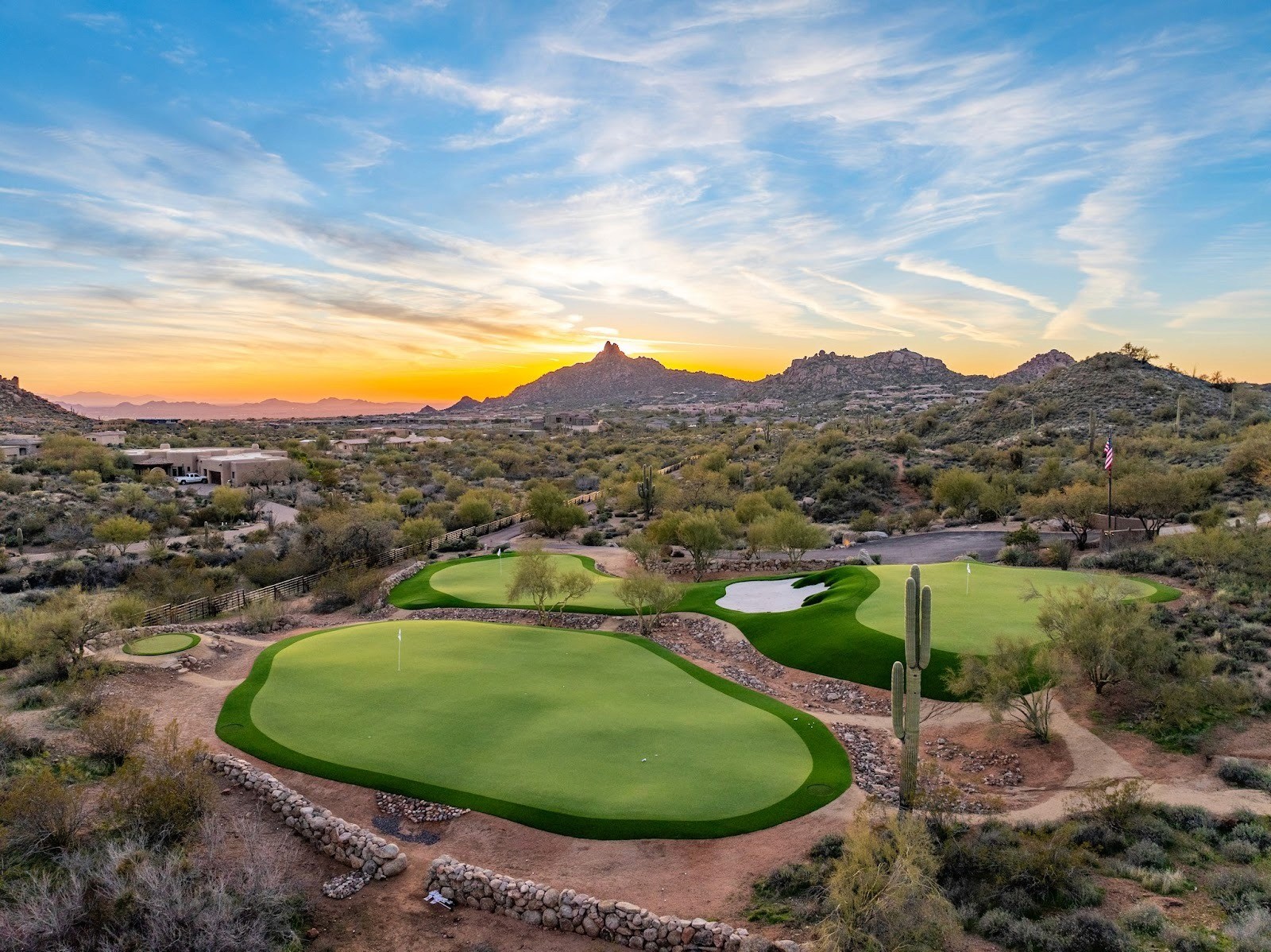 The centerpiece of Saguaro Point is its sprawling short-game complex, designed and built by Celebrity Greens. This isn’t your average putting green; the layout features four separate greens, six tee boxes, two bunkers, and elevation changes of nearly 100 feet from tee to green. The complex allows guests to practice a wide range of shots, from short putts to approach shots of up to 160 yards, all without leaving the property.