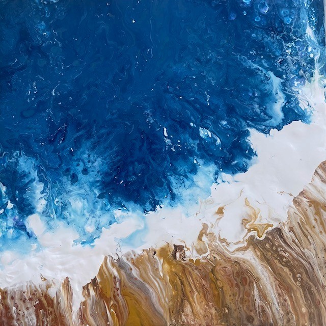 Joanna works primarily with acrylics on canvas, often combining them with abstract fluid techniques, watercolours, and gold leaf. Texture plays a key role, as do layered surfaces that suggest depth and movement. Her brushstrokes are expressive, and her color palette tends toward bold, luminous tones that echo the coastal environment in which she lives.