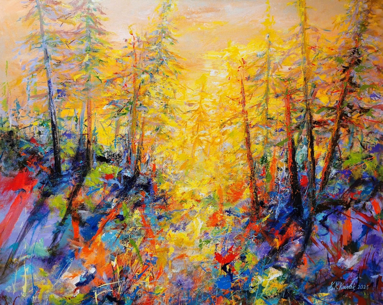 Kasak’s work is characterized by a "vibrant, colorful" palette that seeks to intertwine the recognizable forms of the natural world with the boundless possibilities of abstraction. Her method is deeply intuitive; she does not begin with a rigid blueprint but allows the mood, color, and inner sensations of the moment to guide the brush (or the knife).
