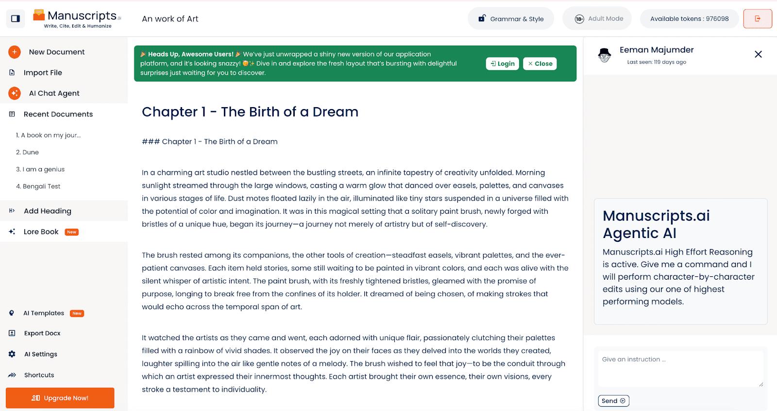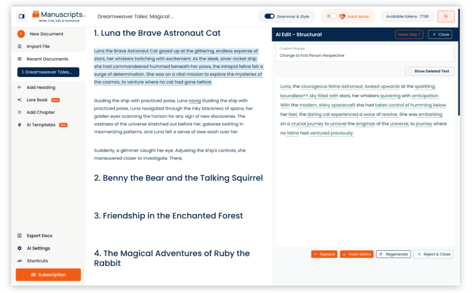 What sets Manuscripts.ai apart is the Humanizer. AI-generated content can sometimes lack nuance or the subtle qualities of human expression. The Humanizer is designed to adjust machine-generated text, enhancing readability while maintaining the writer’s unique voice. This ensures that each piece of writing, from academic papers to creative stories, retains authenticity and feels genuinely human, blending efficiency with emotional resonance.
