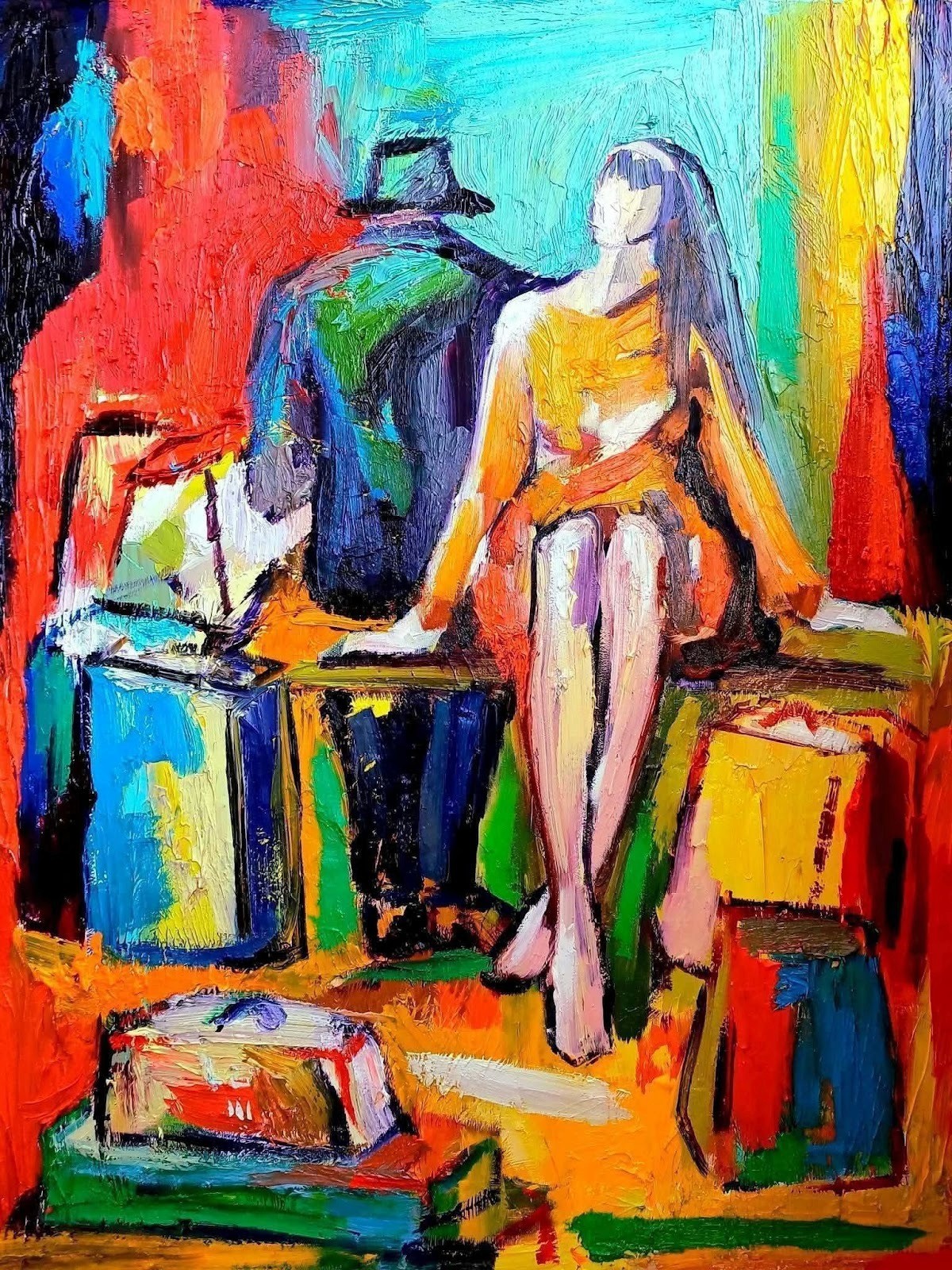 Living and working in Sofia, Bozhanova has exhibited widely, both within Bulgaria and internationally. These experiences have contributed to the formation of a personal style that is immediately identifiable, yet flexible enough to accommodate figurative scenes, abstract landscapes, and compositional experiments involving people and objects. Her work reflects an ongoing engagement with life as it unfolds, guided less by narrative certainty than by observation, intuition, and emotional resonance.