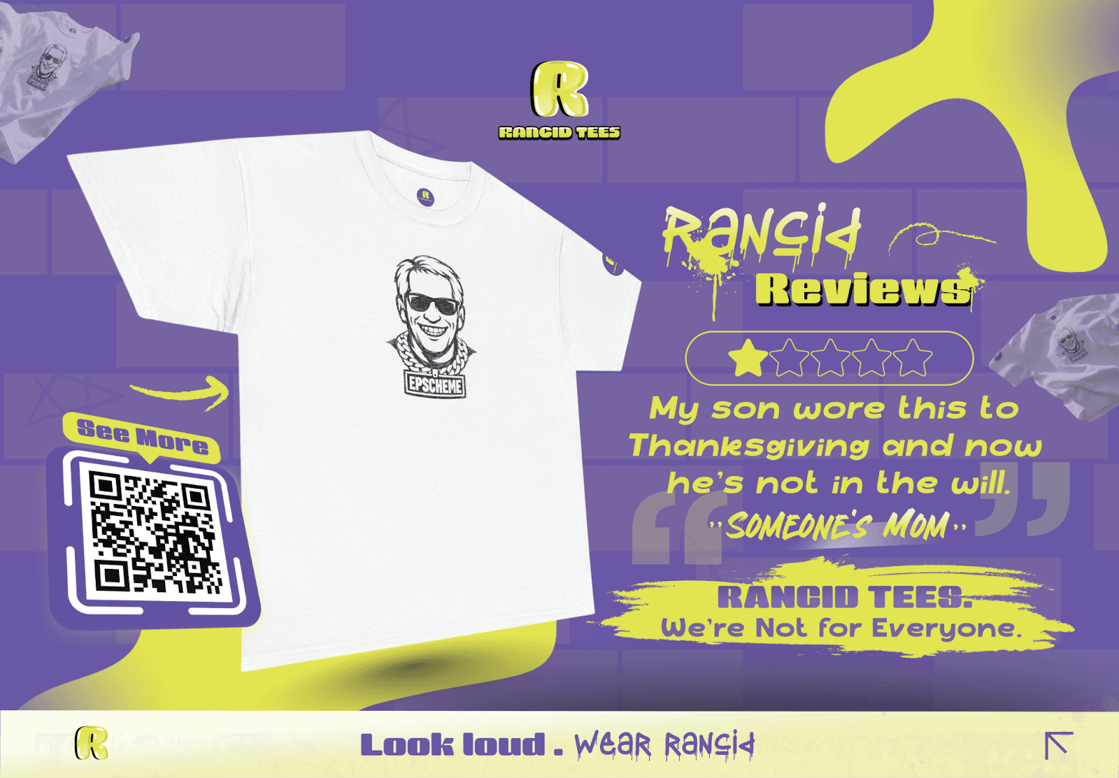 What truly set Rancid Tees apart was its unapologetic approach to cultural commentary. The brand’s designs often feature bold, sarcastic takes on current events, poking fun at everything from popular culture to societal norms. One of their standout designs, the "Look Loud. Wear Rancid" shirt, became an instant conversation starter, while their other graphic tees sparked debates on fashion and individuality.