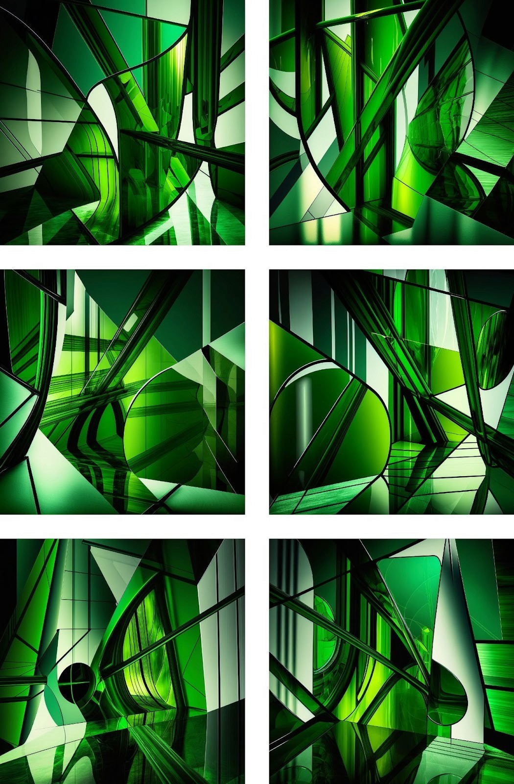 „Chromium Oxide Green Reflections”, digital homage to the „‚radies’–Polyptych“ from 2001, 6 variations, AI-generated artwork, digital print on canvas, mounted on wooden stretcher frame, edge printing, each 50 × 50 cm, 2022