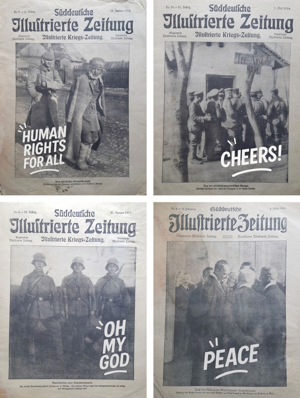 „War Polyptych”, historical newspaper front page, AI-generated clip art, digital image editing, No. 2, 5, 9 and 22 of a 22-part series, 2020/2025