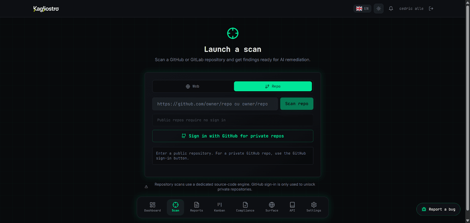 Kagliostro extends its offensive approach into private repositories, securely connecting to platforms such as GitHub. It analyzes code for exposed secrets, flawed logic, and overlooked security gaps that could be exploited.