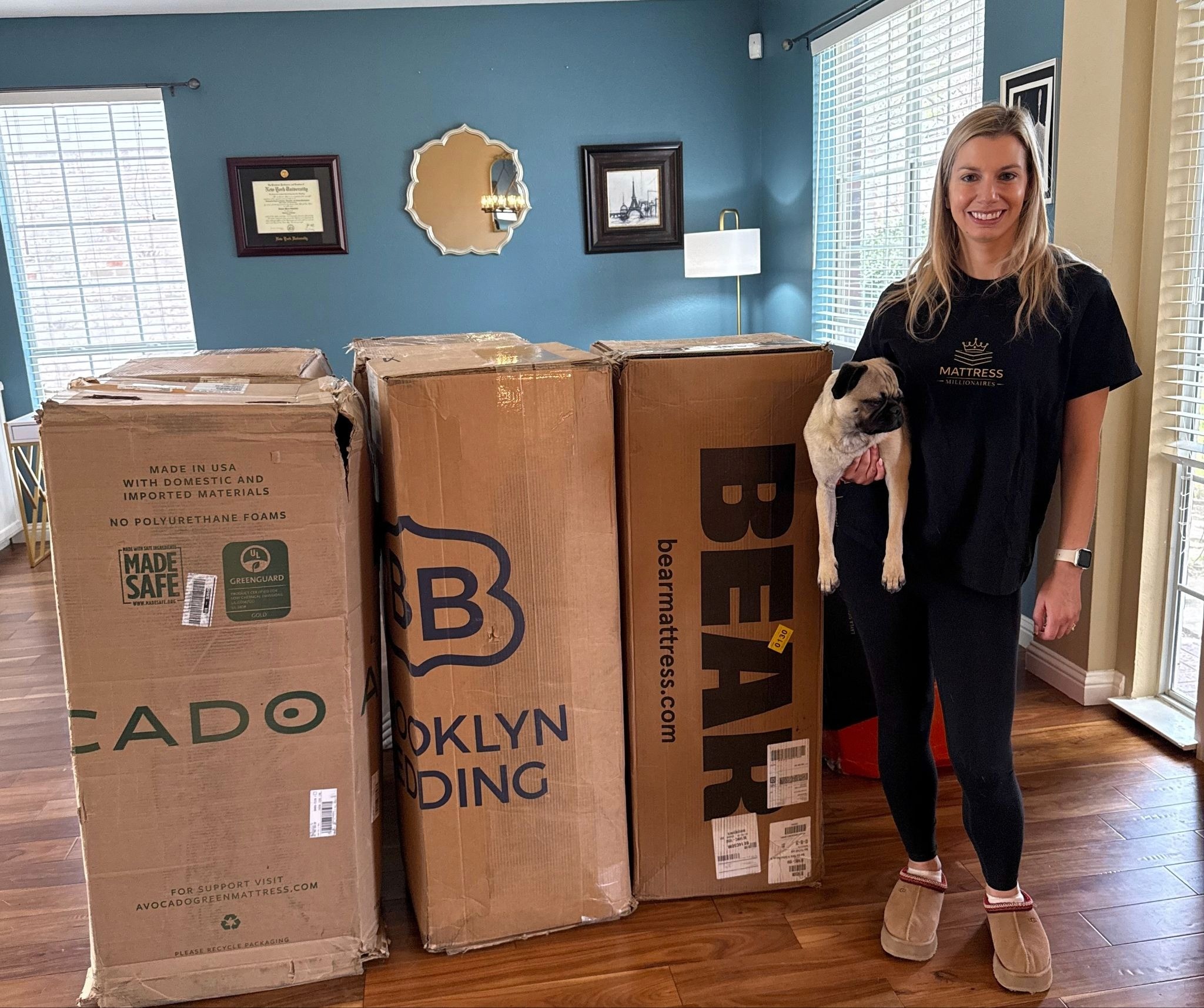 Jeanne Schneider stands with several boxed mattresses delivered for testing, illustrating the growing complexity of the online mattress market that MattressMillionaires.com aims to simplify